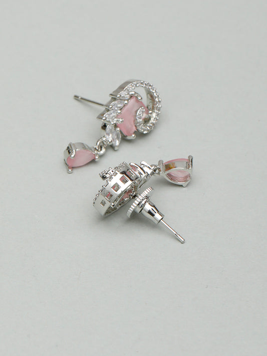VIVAZS Silver-Plated American Diamond Pink Studded Teardrop Shaped Drop Earrings