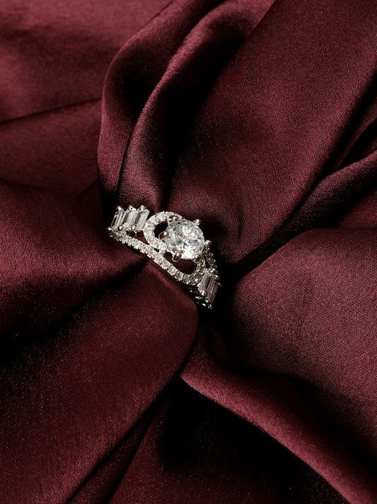 VIVAZS Silver Plated AD-Studded Contemporary Solitaire Adjustable Finger Ring