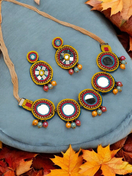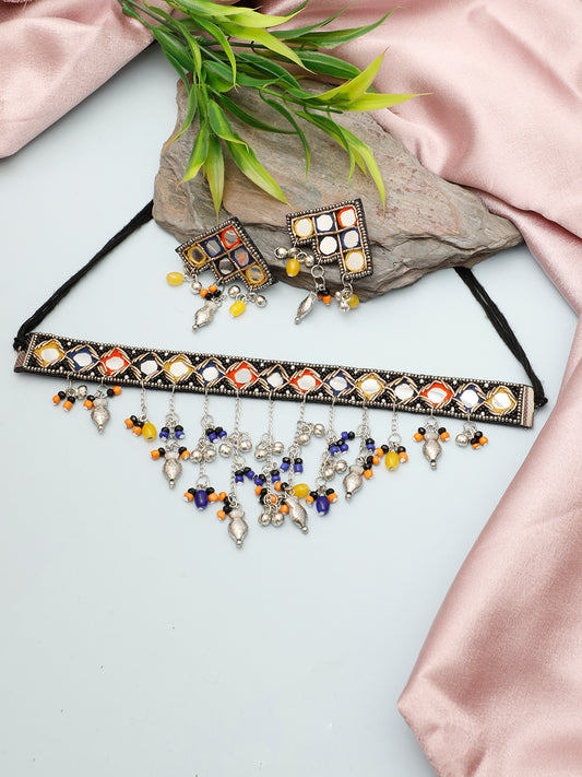 VIVAZS Mirror, Beads And Fish Charms Hand Embroidered Oxidised Jewellery Set
