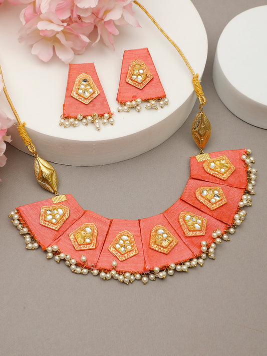 VIVAZS Gold Plated & Pearl Sky Peach Beaded Jewellery Set