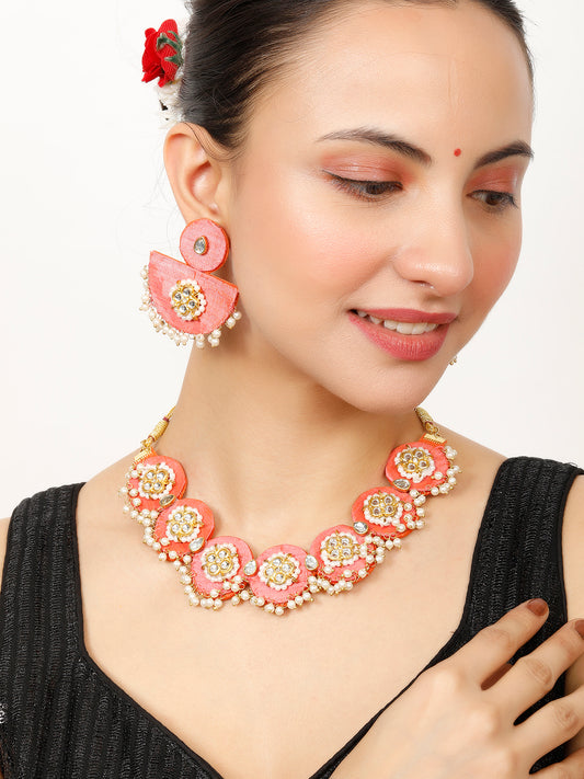 VIVAZS Gold Plated & Peach Pearl Beaded Jewellery Set