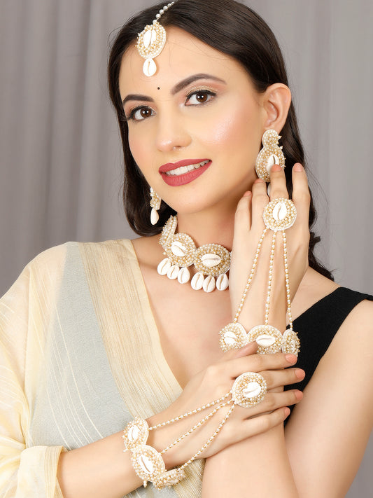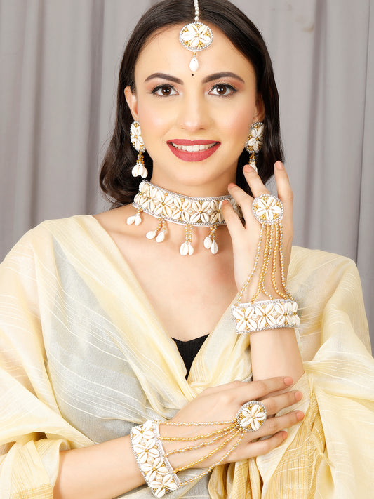VIVAZS Studded Shell Choker Jewellery Set With Maangtika ,Earrings and Hathphool