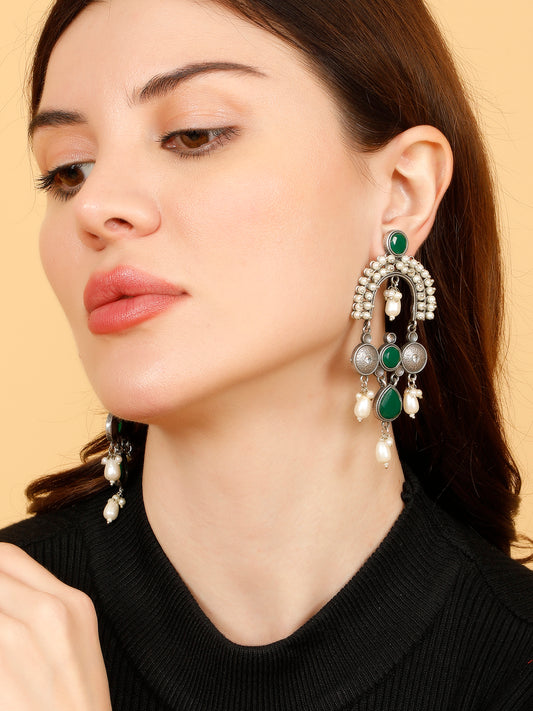 VIVAZS Silver-Plated Contemporary Stone Studded & Beaded Oxidised Drop Earrings