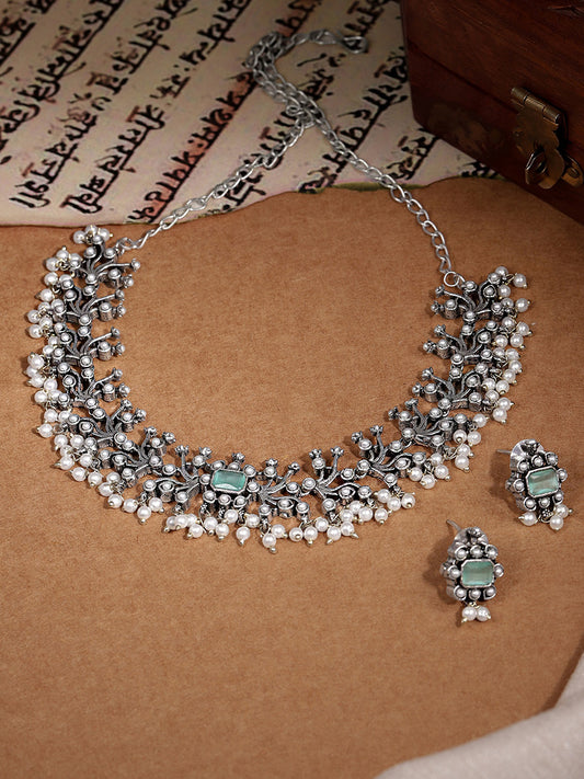 VIVAZS Silver-Toned Kundan Stone-Studded & Beaded Oxidised Jewellery Set