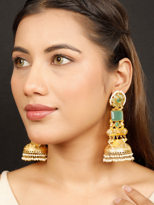 VIVAZS Handmade Gold Plated Long Green Jhumka Earrings | Contemporary