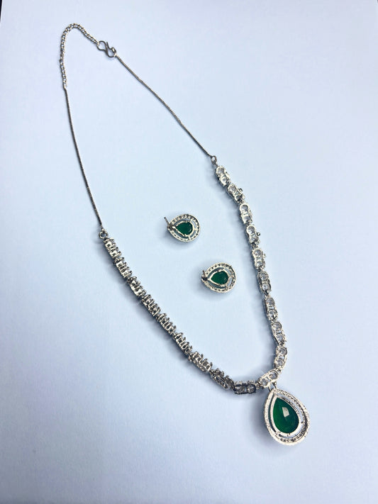 Sliver-Plated Emerald American Diamond-Studded Jewellery Set