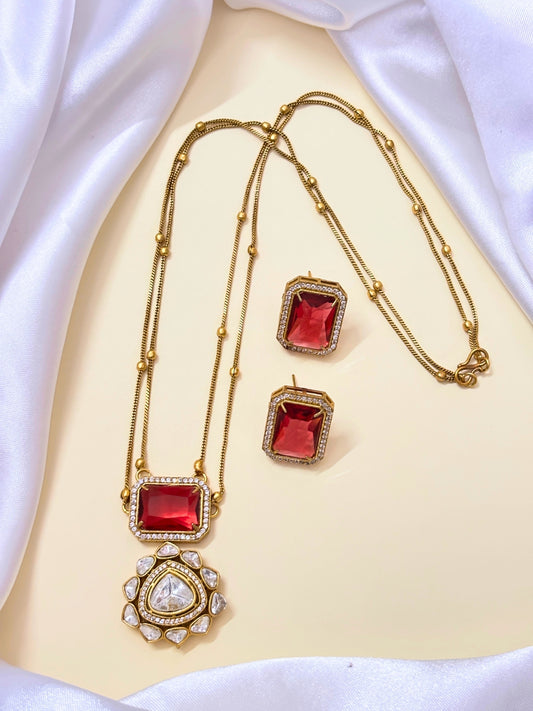 VIVAZS Premium 22K Gold Plated Ruby Red Polki and CZ Studded Double Layered Trendy Necklace Set with Earrings