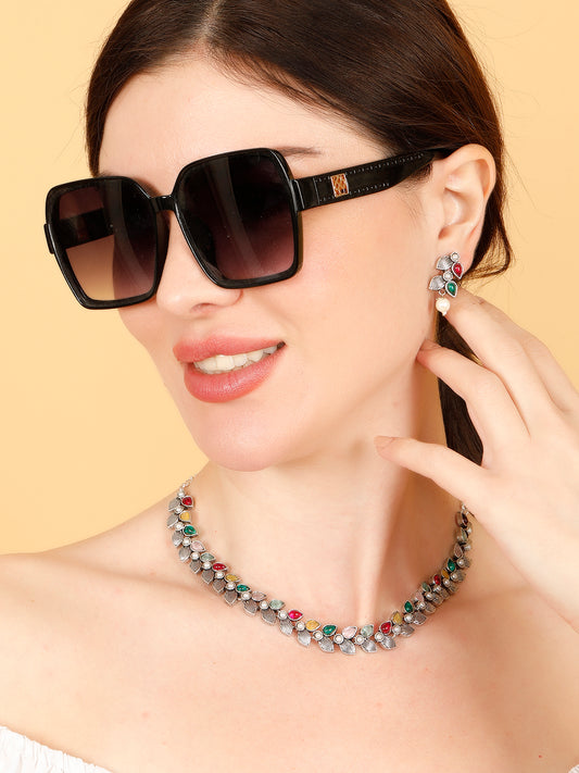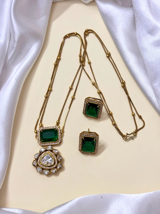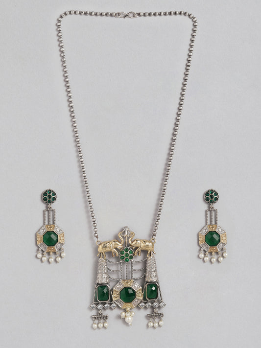 VIVAZS Dual Tone Green Emerald Studded Oxidised Necklace Set