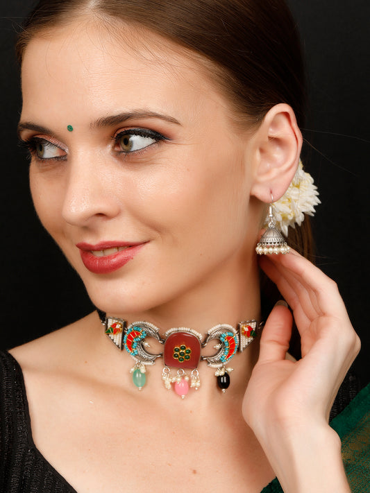 VIVAZS Stylish Oxidised Silver Choker with Monalisa Stone Jewellery Set