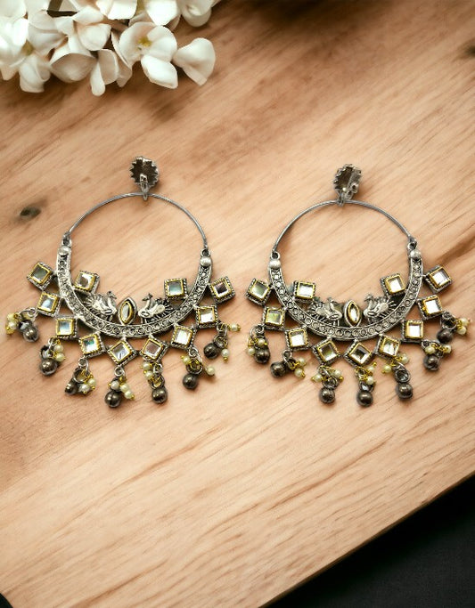 VIVAZS Silver-Plated Peacock Shaped Contemporary Drop Gungaroo Chandbali Earrings