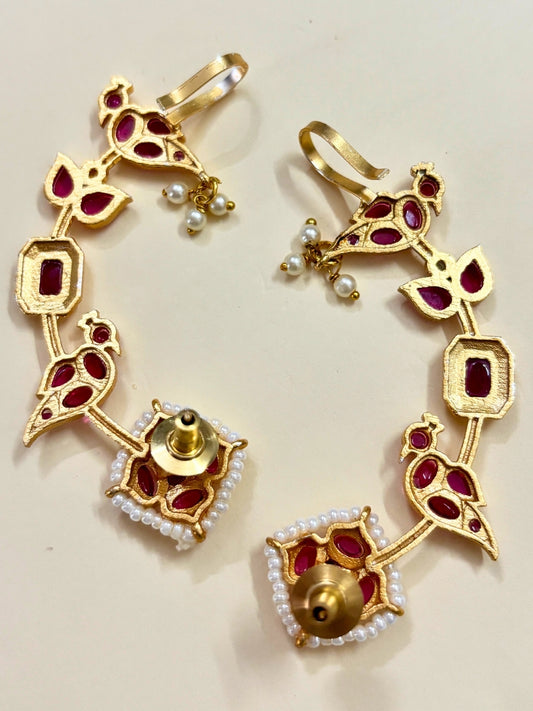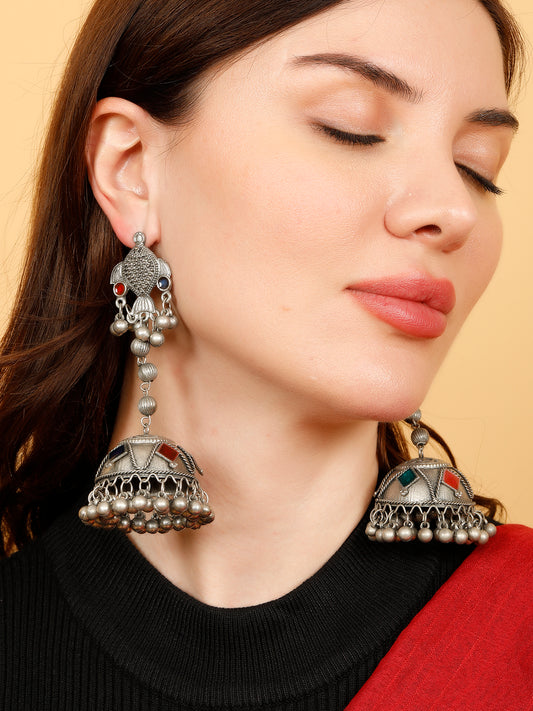 VIVAZS Women Oxidised White Pearls with Ruby Birds Multi Jhumka Earrings
