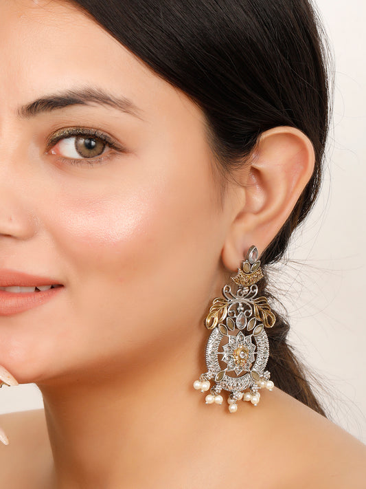 VIVAZS Oxidised Silver-Plated Dual Tone Gold and Silver Yellow Stone Chanbalis Earrings