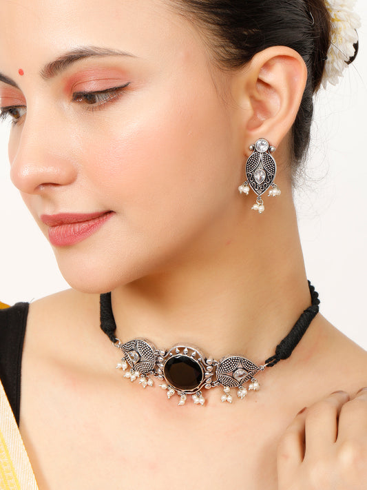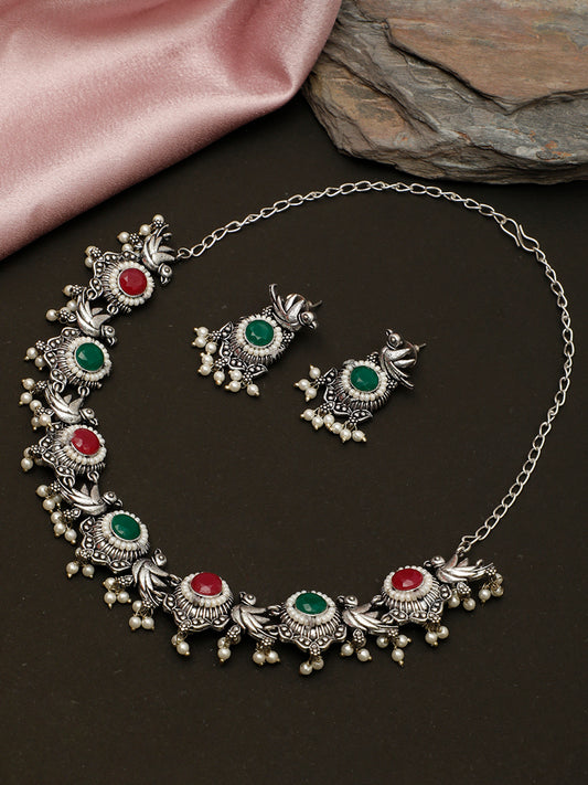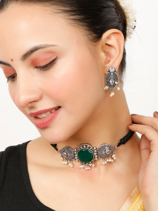 VIVAZS Silver-Plated Oxidised Choker Necklace and Earrings(Green)