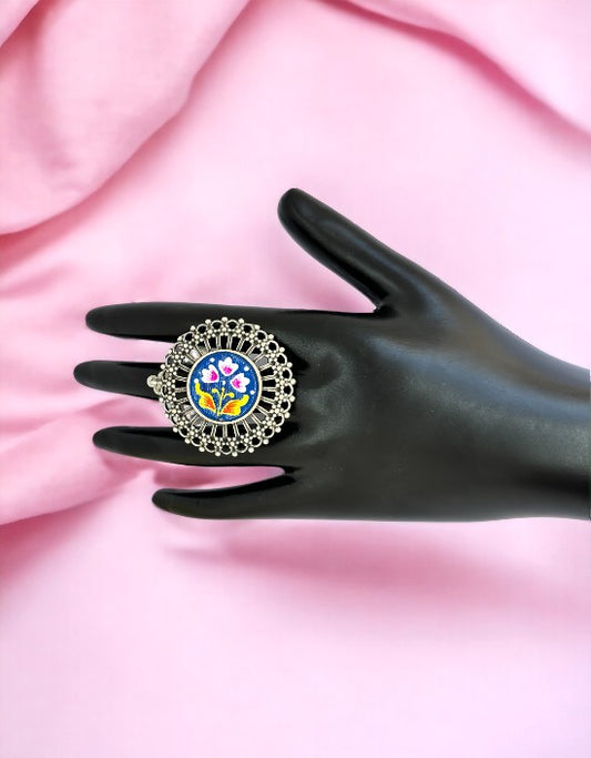 VIVAZS Silver Look alike Blue flower Oxidized Ring