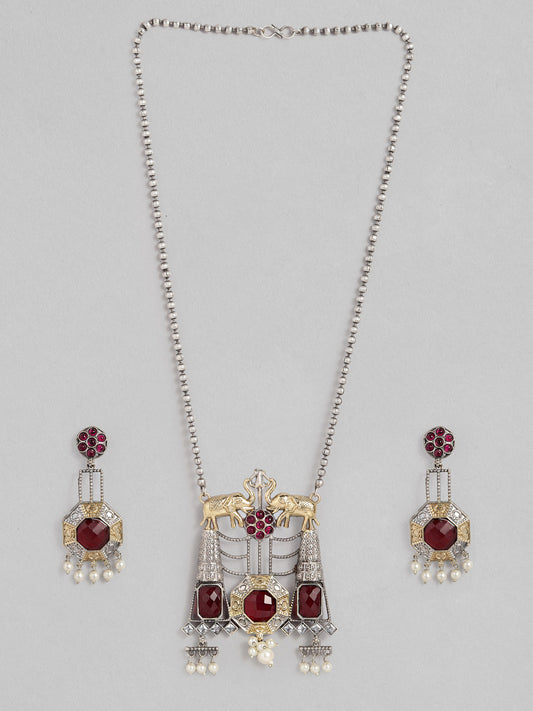 VIVAZS Dual Tone Red Ruby Studded Oxidised Necklace Set