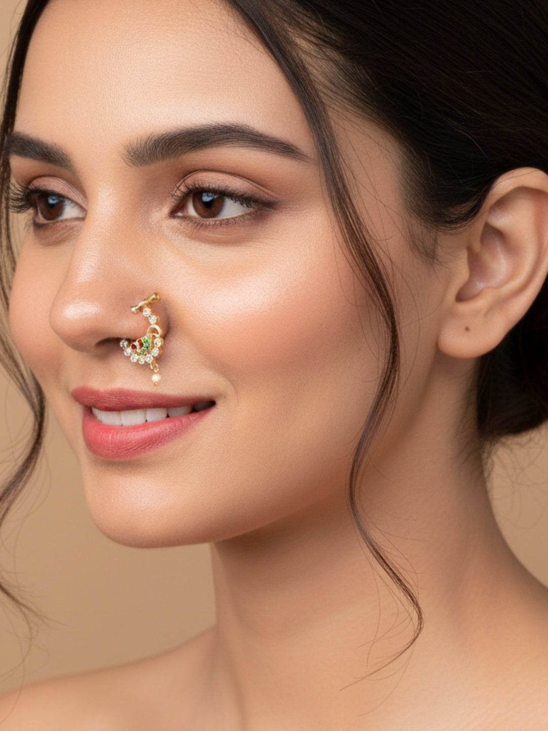 Occasion: Add a touch of elegance to your ethnic look with this beautiful silver-plated, Rose- Gold and Gold-Plated nosepin, studded with white American diamonds. Pair it with matching AD earrings and chokers for weddings, Karwa Chauth, Diwali, Durga Puja, Navratri, Raksha Bandhan, Bhai Dooj, and other festive occasions. A perfect jewellery piece to shine at every celebration.