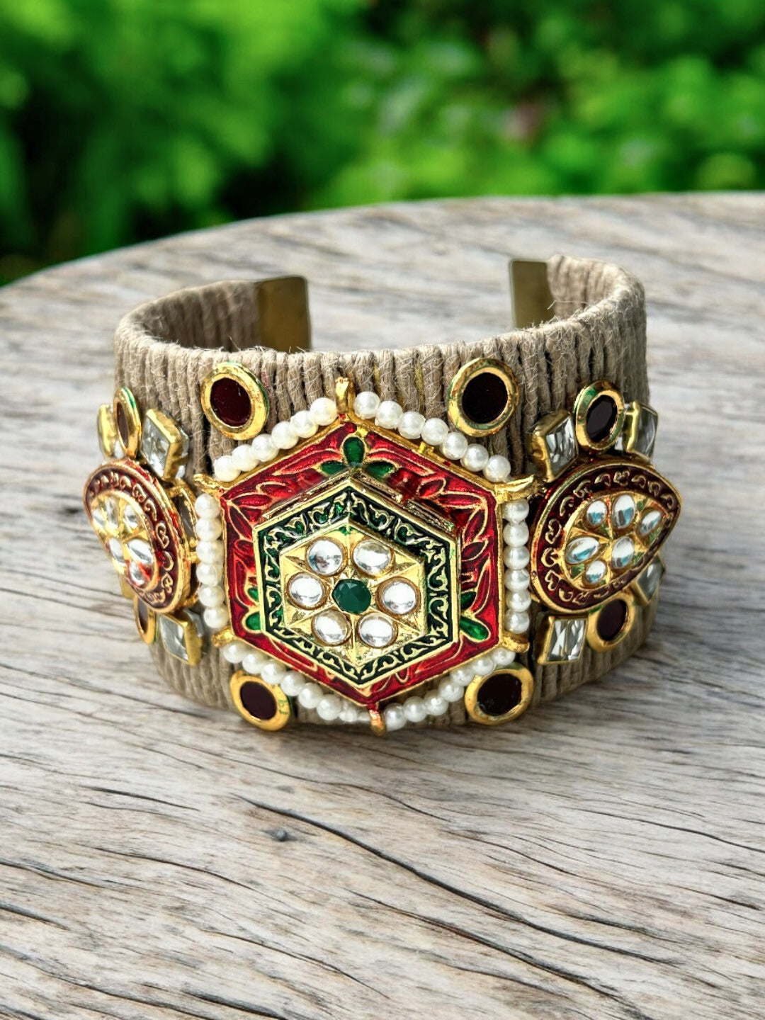 VIVAZS Golden ,Green and Red Kundan Adjustable Jute Bracelet