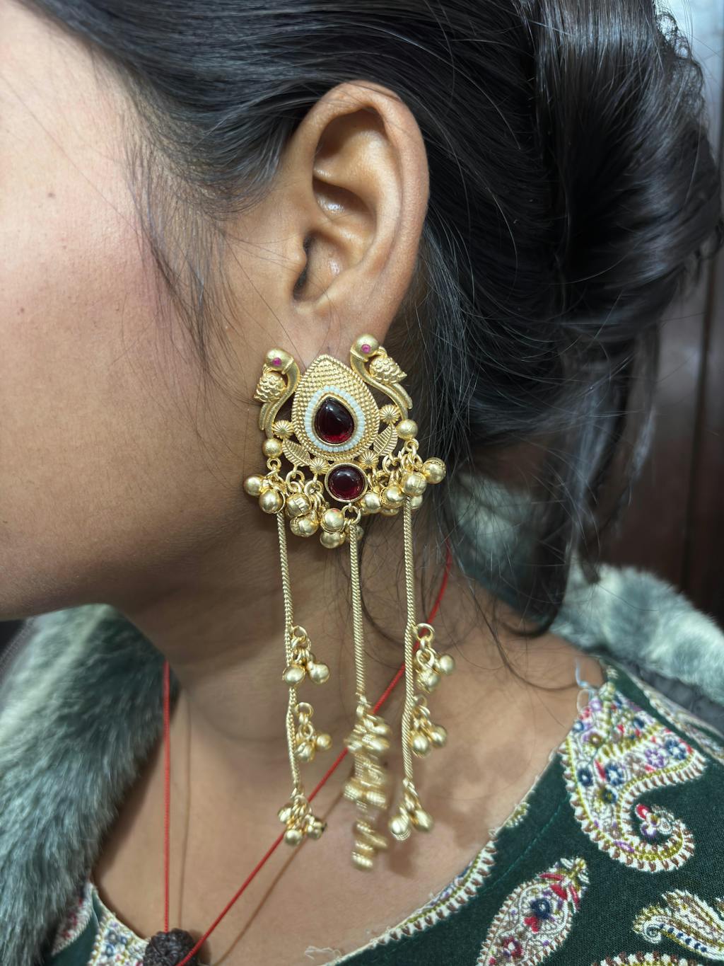 Pair this Kasmiri Drop Earrings with a saree and a matching blouse or experiment with contrasting colors for a modern twist.